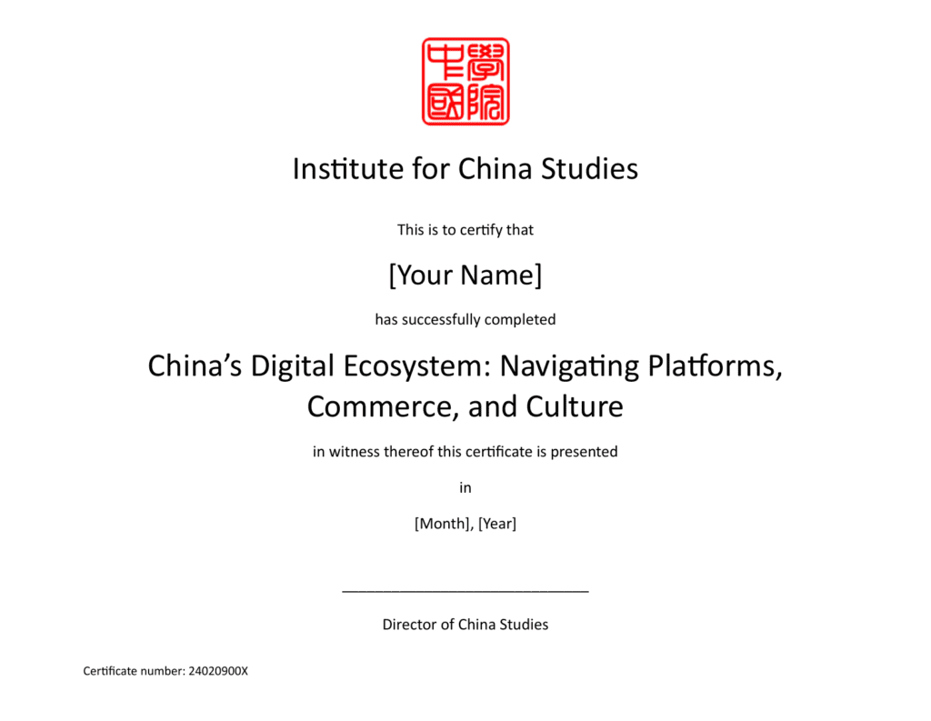 Upon successful completion of the program, you will earn a digital certificate of completion from the Institute of China Studies.