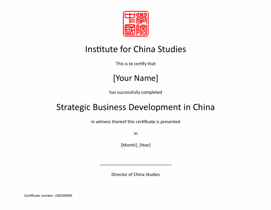 Note: After successful completion of the online program, your verified digital certificate will be emailed to you in the name you used when registering for the program. All certificate images are for illustrative purposes only and may be subject to change at the discretion of the Institute of China Studies.